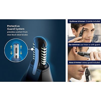 تیغه‌ های استیل ضد زنگ این موزن، دوام بالایی دارند و در برابر رطوبت مقاوم هستند. عملکرد چرخشی و خطی هم‌ زمان تیغه‌ ها باعث می‌شودموهای زائد از زوایای مختلف به‌ راحتی اصلاح شوند. این ویژگی در اصلاح موهای ضخیم و کوتاه داخل بینی و گوش بسیار مؤثر است. همچنینوجود شانه‌ی مخصوص ابرو، امکان مرتب‌ سازی و اصلاح دقیق ابروها را فراهم می‌کند.